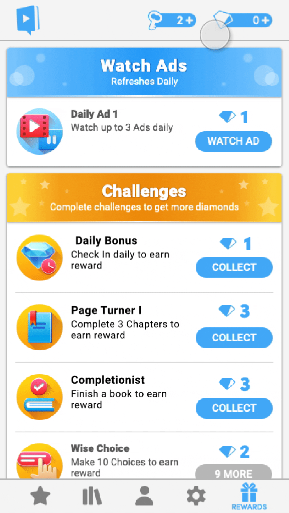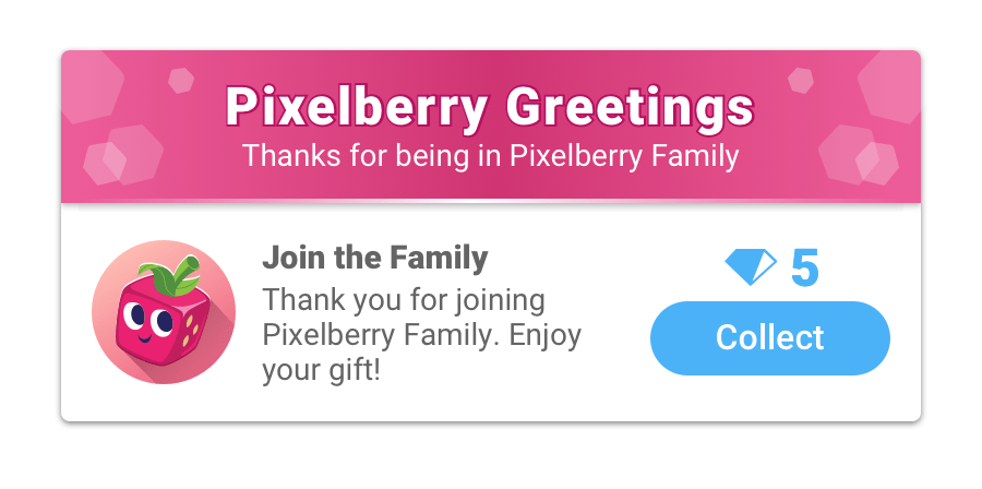 A potential number of categories can grow, but right now we have a variety of 3 categories that can be configured and rearranged: Pixelberry Greetings, Watch Ads, and Challenges.