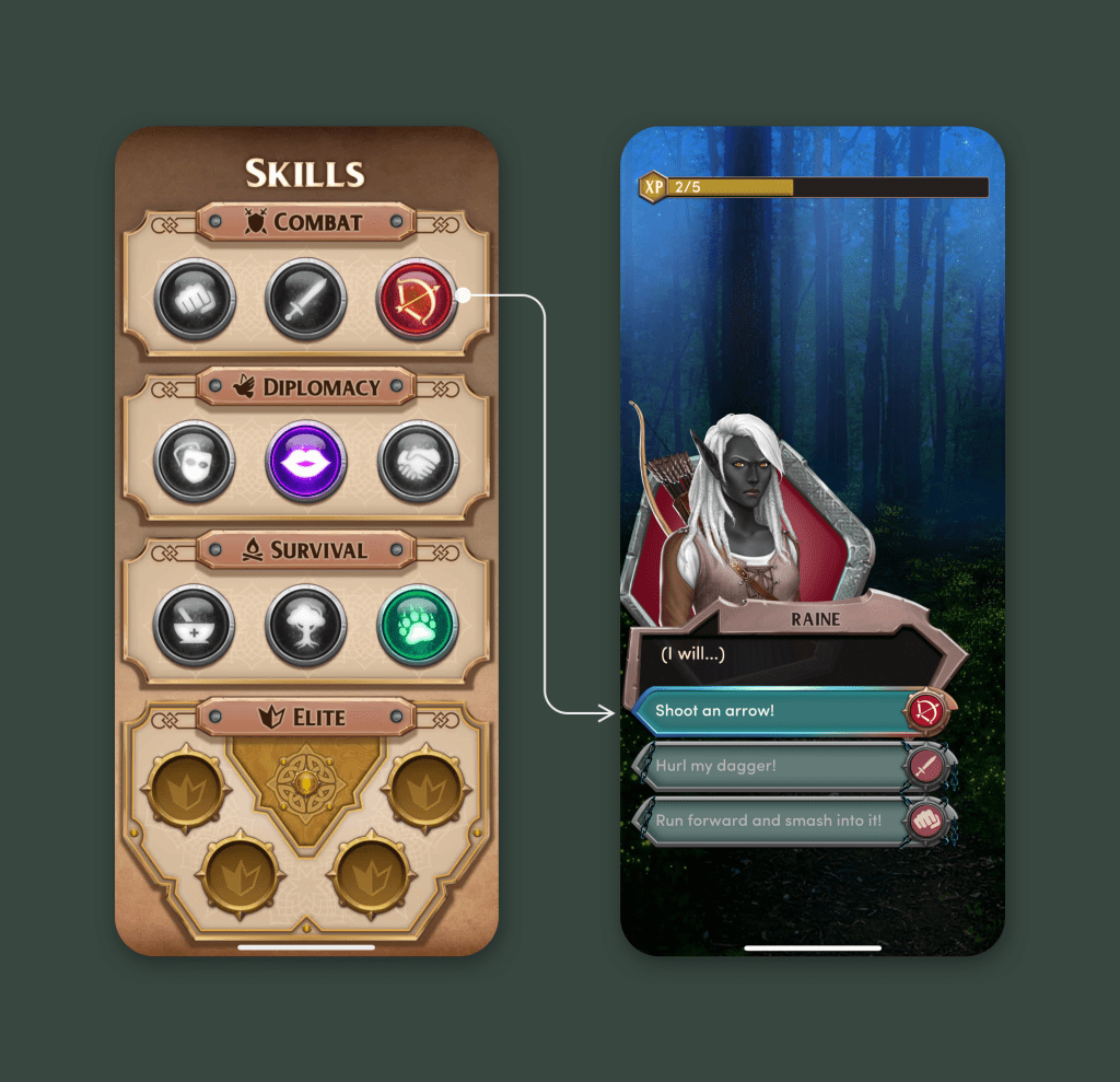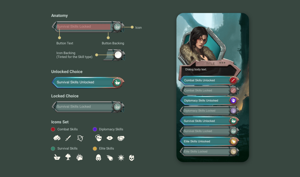 I created 2 states for the choice button: locked and unlocked, and a set of icons for the skill tree. Each skill category is associated with a specific color, so icon backing is tinted to category type.